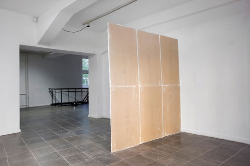 Auf der Rückseite der Wand aus Gipskartonfragmenten sind die Spuren ihres Transportes aus Istanbul nach Dortmund ersichtlich. Sie wurde an die architektonischen Bedingungen des Ausstellungsraumes in Dortmund angepasst und wieder aufgebaut. Bei »Wall Waxing« ist das Thema des Verschickens die Vorgabe für die Wahl des Materials Paketband. Die gesamte Ausstellungswand wurde mit Paketband überklebt, um hinterher abgezogen zu werden. Die Entfernung hinterlässt Spuren auf beiden Trägeroberflächen. Diese minimalen Eingriffe stellen den Betrachtenden vor die Herausforderung, mit geschärftem Blick Veränderungen des Raumes und seine architektonischen Details wahrzunehmen und zu hinterfragen.