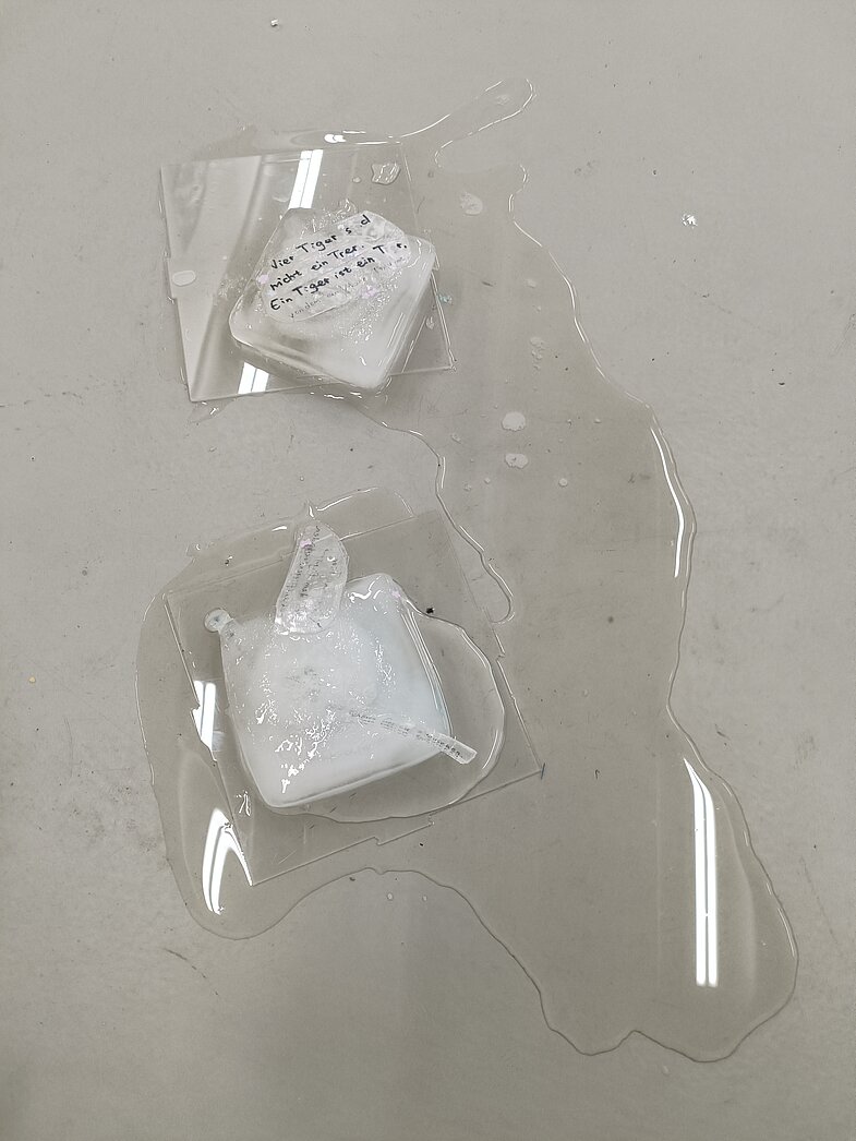 Während einer Live-Performance wird Eis als Körper präsentiert, der von Metall durchbohrt ist. Während das Eis kontinuierlich schmilzt, fällt das darin eingebettete Metall Stück für Stück ab. Der Klang verschwindet während dieses Prozesses allmählich. Man hört zu, wie der Körper in Vergessenheit gerät, und stellt sich das Verschwinden des Klangs vor. Nach der Performance präsentiert die Ausstellung ihre Überreste: Fotos der Performance, prozessbezogene Materialien und imaginative Tonaufnahmen. Diese Überreste reproduzieren nicht die Performance, sondern verweisen auf einen Zustand, in dem etwas einst vorhanden war und nun fehlt. Die Arbeit konzentriert sich auf die Beziehung zwischen dem Unsichtbaren, dem Körper und der Erinnerung.