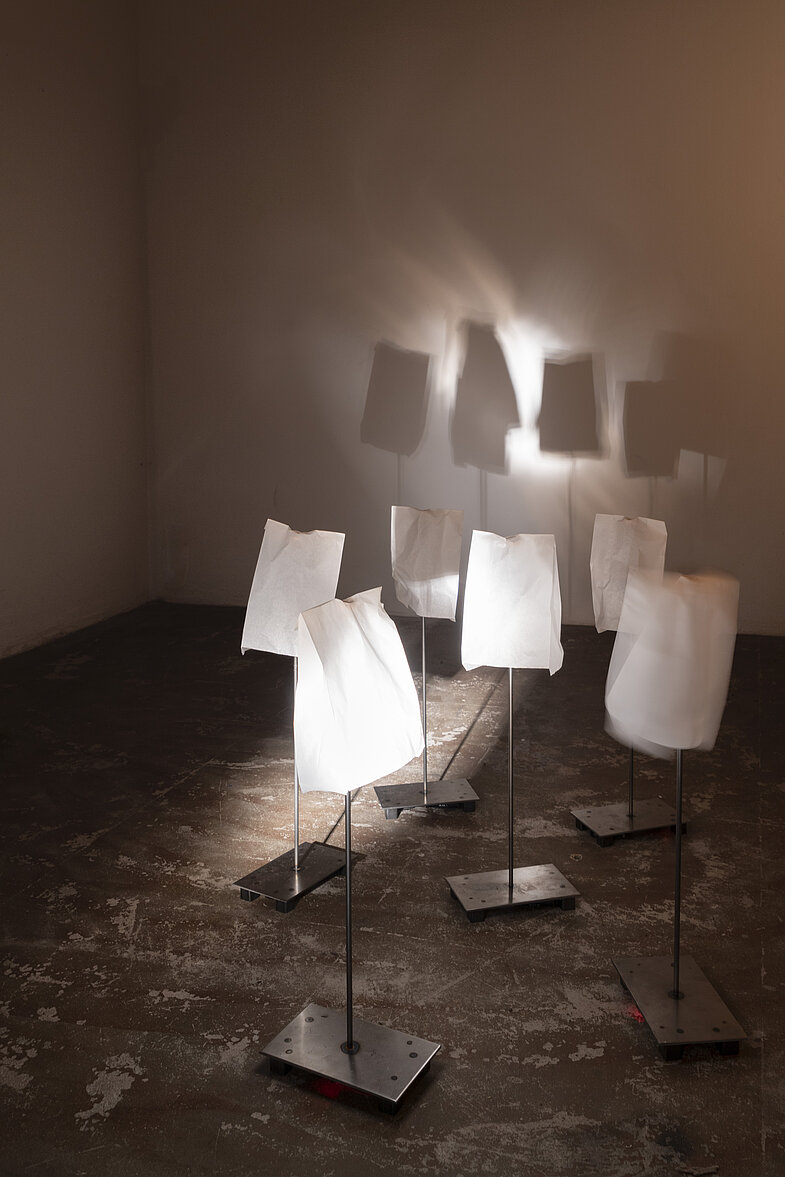 Mithilfe mehrerer nicht sichtbarer ESP32-Module drehen sich die Papiertüten mal einzeln, mal zusammen um die eigene Achse. Der Klang des Papiers ist leise und ist abhängig von der Position der Papiertüten auf den Sockeln.