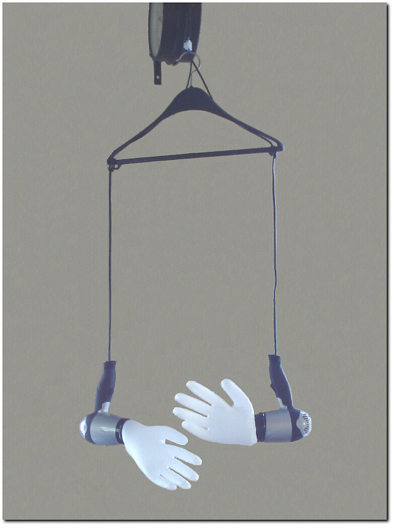 Zwei Haartrockner, deren Lüftungsöffnungen mit Gummihandschuhen verstopft sind, blasen, bis ihr Überhitzungsschutz sie abschaltet. Sobald sie abgekühlt sind, beginnen sie erneut zu blasen. Ihr individueller Rhythmus führt zu einem Handschlag in unregelmäßigen Abständen von etwa 1 ½ Stunden.