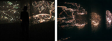 Die Leuchtstrukturen basieren auf Nachtflug-Aufnahmen des Ruhrgebietes. Durch digitale Collage sind Überstrukturen entstanden, die nicht mehr eindeutig der Erdoberfläche zugeordnet werden können, sondern an Aufnahmen von Sternenclustern, Galaxien oder Supernovae erinnern. Auf mehrere Ebenen halbtransparenter Stoffbahnen projiziert, die sich im Wind zweier Ventilatoren wiegen, entsteht eine Räumlichkeit, die den ephemeren Charakter der Motive unterstreicht. Das mechanische Klicken der Projektoren beim Diawechsel und das Rauschen ihrer Lüftungssysteme vervollständigen die fremdartige Szenerie.